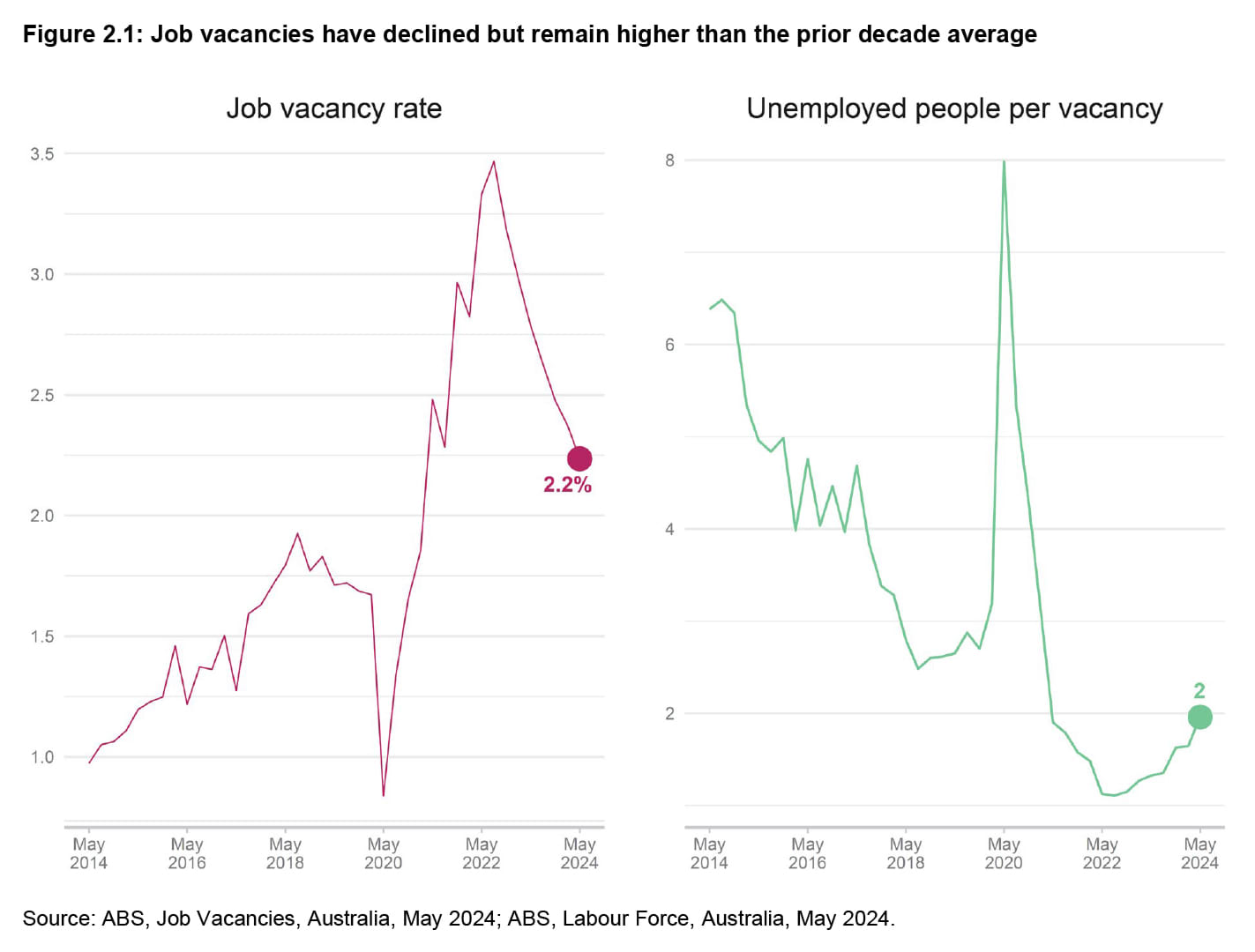 Job vacancies as a share of the Victorian labour force (as measured by the job vacancy rate) have declined from the highs reached in late 2022 but remain higher than the average over the prior decade.