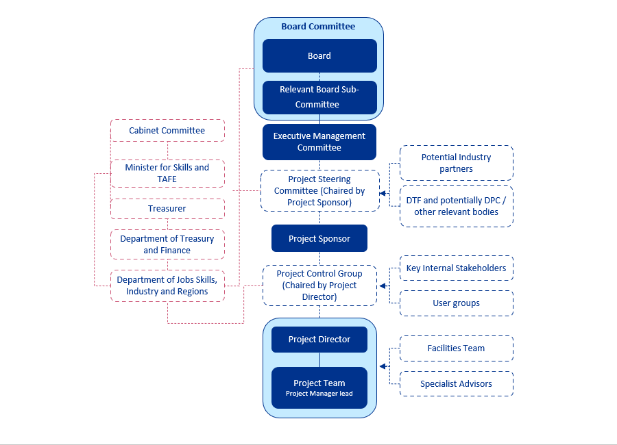 This governance structure may need to be modified depending on the TAFE’s internal governance structure and processes, as well as the specifics of the project. However, DTF and specific Treasurer approval requirements must be included in all HVHR project governance structures.