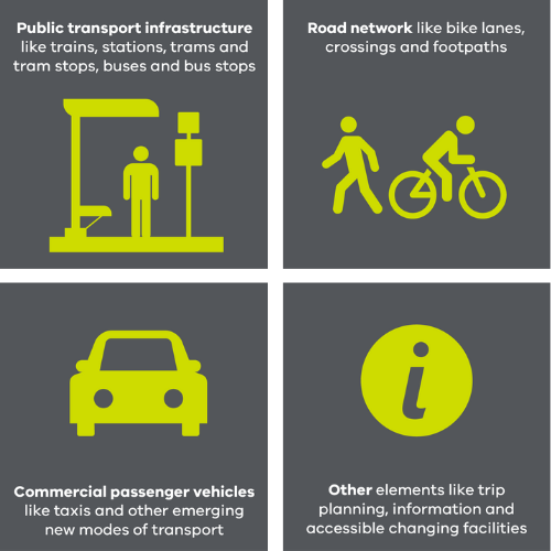 The Strategic Framework also covers all stages involved in making a journey, including pre-journey planning, when you leave home and when you get back home, interchanges, and during a trip. This includes making a trip on board a vehicle, getting in or out of a car, bus, tram, train, taxi, rideshare vehicle, or waiting for a transport service. It also includes travelling as a pedestrian on foot or with a mobility aid.