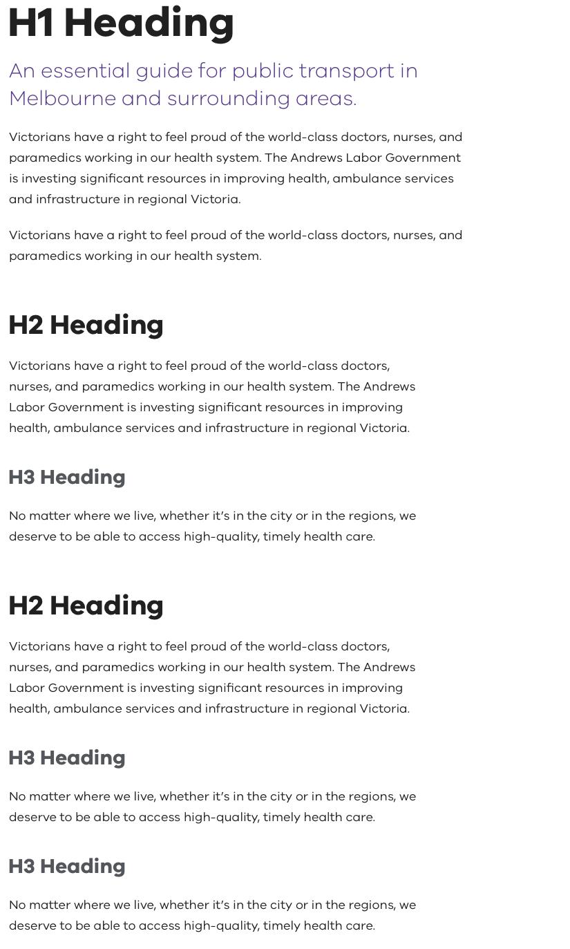 A large subtitle is typically used directly beneath the largest heading on a page (either a H1 or H2). The content of a large subtitle should be concise and act as an elaboration of the H1 or H2 content. VIC Light is the recommended weight. A maximum length of one paragraph is recommended, or three lines.