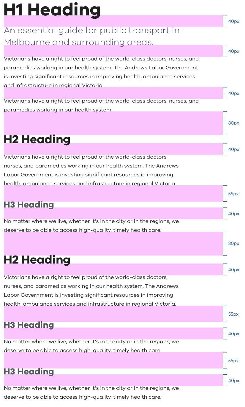 If the spacing does not follow the recommendations outlined, it could result in content becoming ‘flat’ or unbalanced – where sections of the page bleed into one another, making long-form content very hard to digest. It may become unclear which titles, subtitles and/or body copy belong together, resulting in content which is confusing.