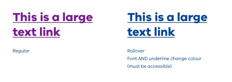 Since the style of body text links is subtler than normal text links, it is important to make sure these links stand out, by using a colour that is different to the body text. Recommended colours are blue or purple. When it comes to social media links, the exact brand colour of a social media site (such as Facebook, Instagram) may be used provided there combinations passes colour accessibility requirements.
