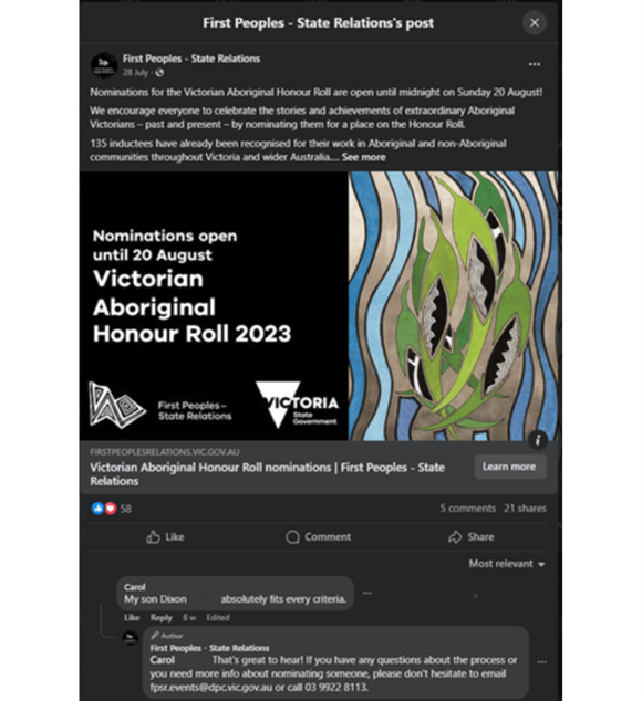When posting on an official government social media account, messages (posts, comments and direct messages) created or received by a public officer should be managed as a public record in accordance with the Public Records Act 1973. You should be keeping all records as required by your department, including any contextual metadata. It is a statutory requirement. However, every government entity has varied requirements for how long each record should be kept and the recording method. Visit the Public Record Office Victoria’s guide for more information on how to comply with your social media record keeping obligations, visit the Public Records Office Victoria website.
