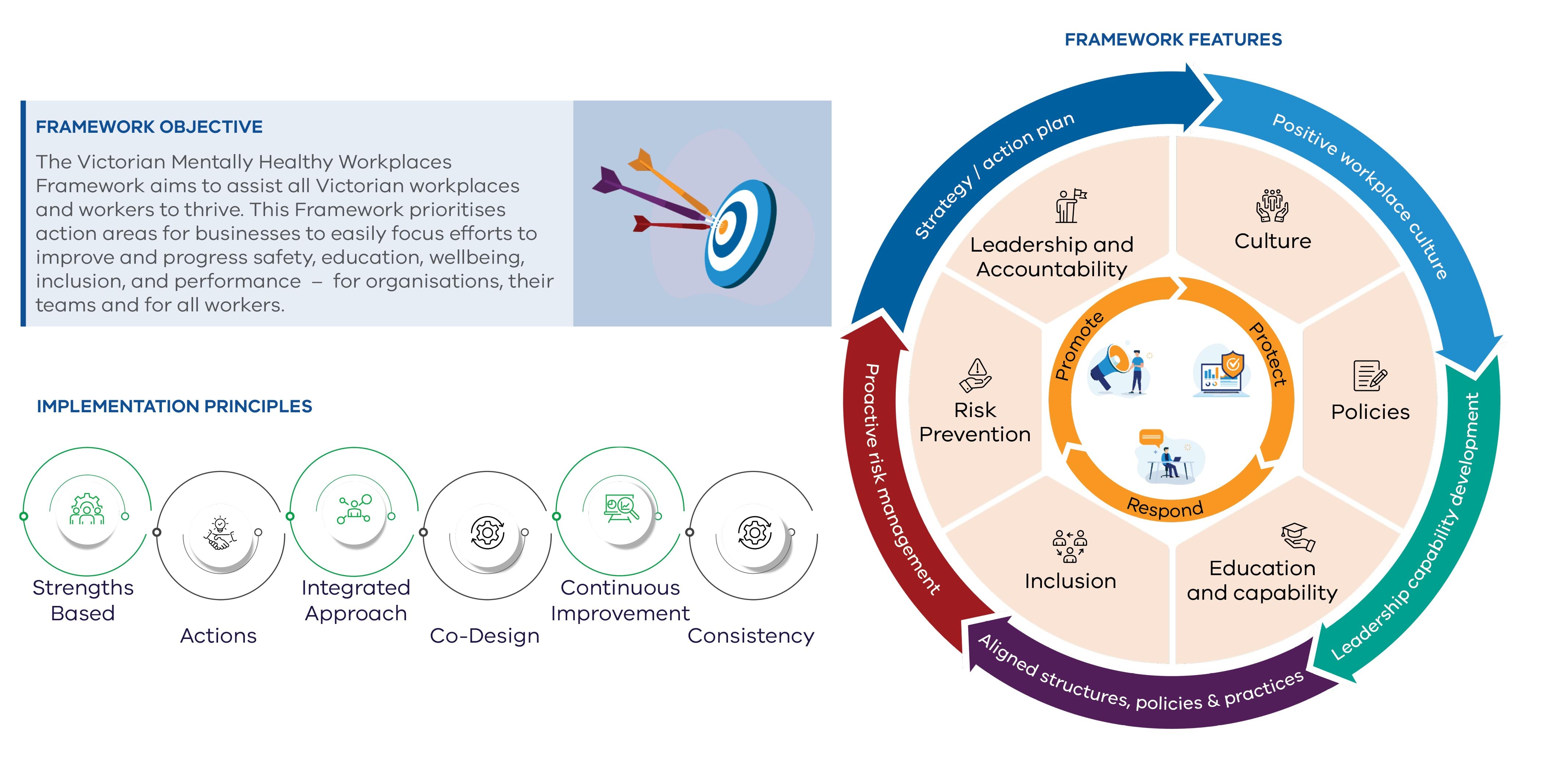 The Framework complements existing resources developed by WorkSafe Victoria, the National Workplace Initiative and Business Victoria to help support Victorian workplaces implement good practices. It includes: