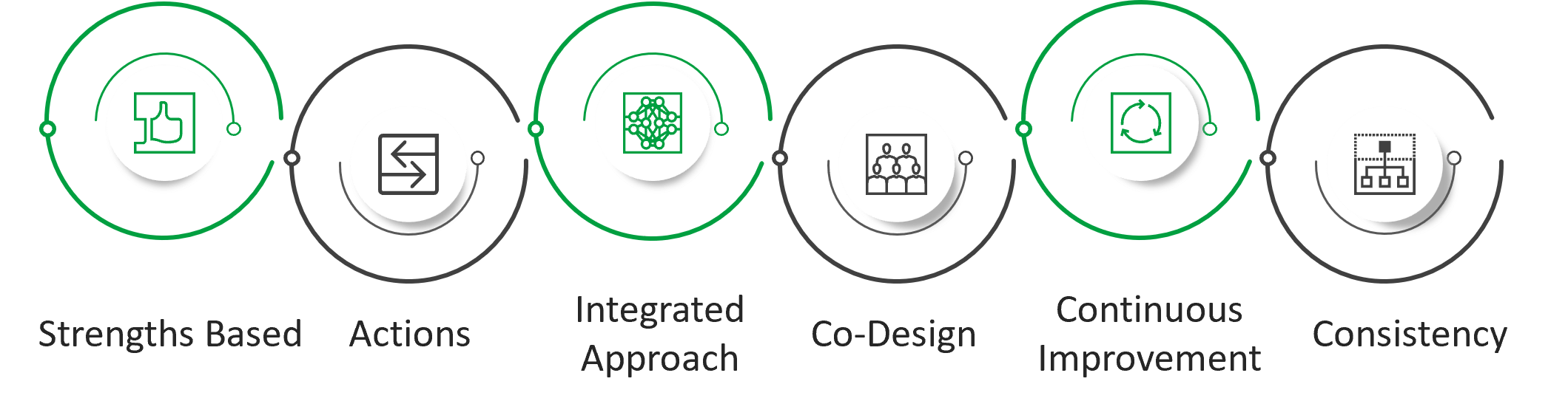 The image contains 6 connected circles, the circles are labeled "Strengths Based; Actions; Integrated Approach; Co-Design; Continuous Improvement; and Consistency".