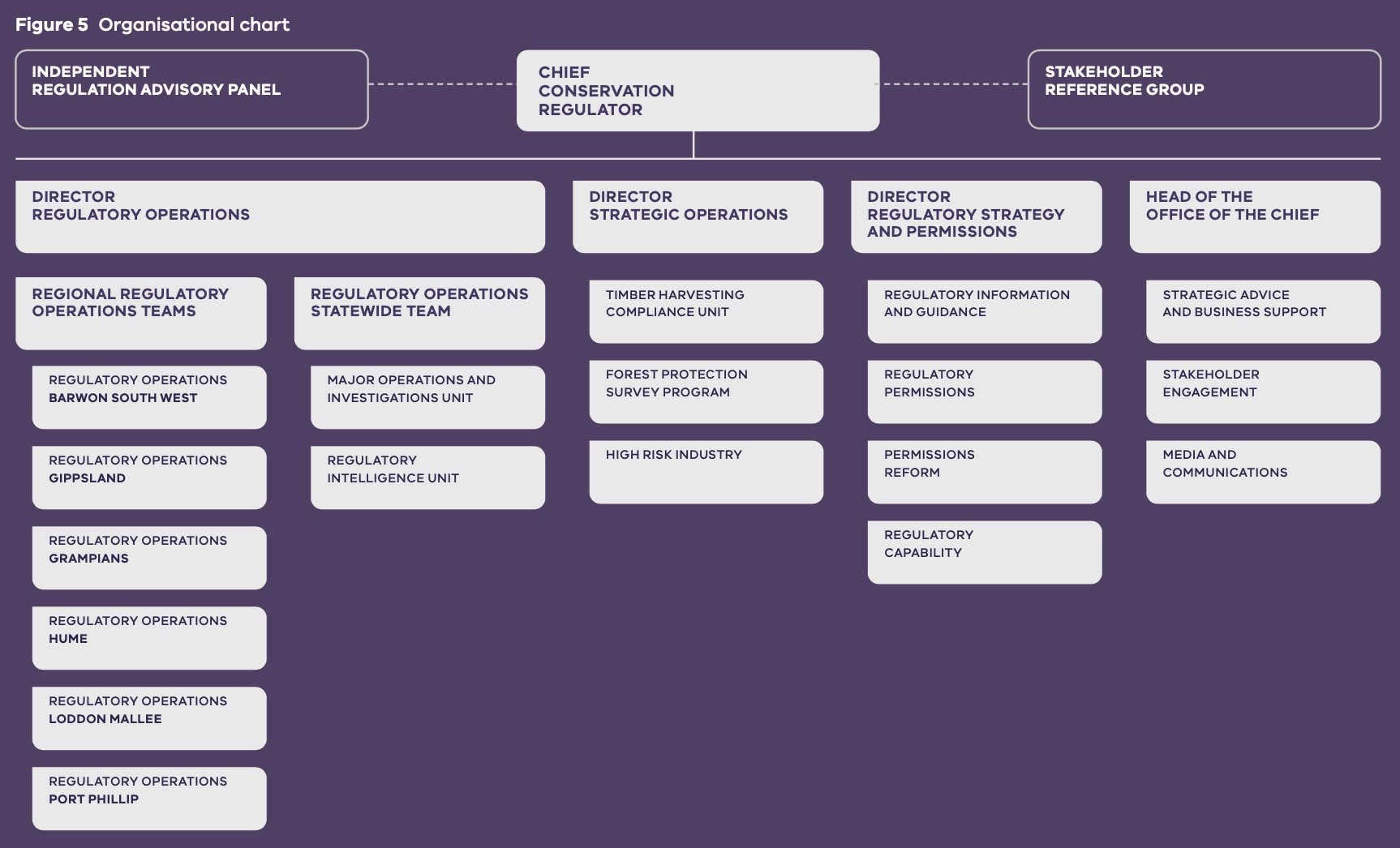 The Conservation Regulator is led by the Chief Conservation Regulator and is comprised of four business units: