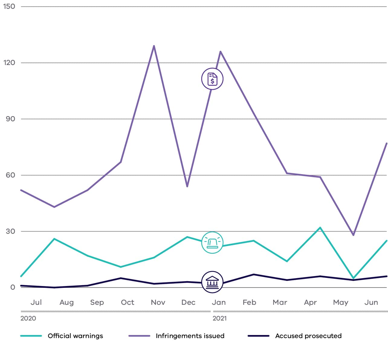 Figure 2 provides a month-by-month breakdown of the number of warnings and infringements issued, and number of accused prosecuted.