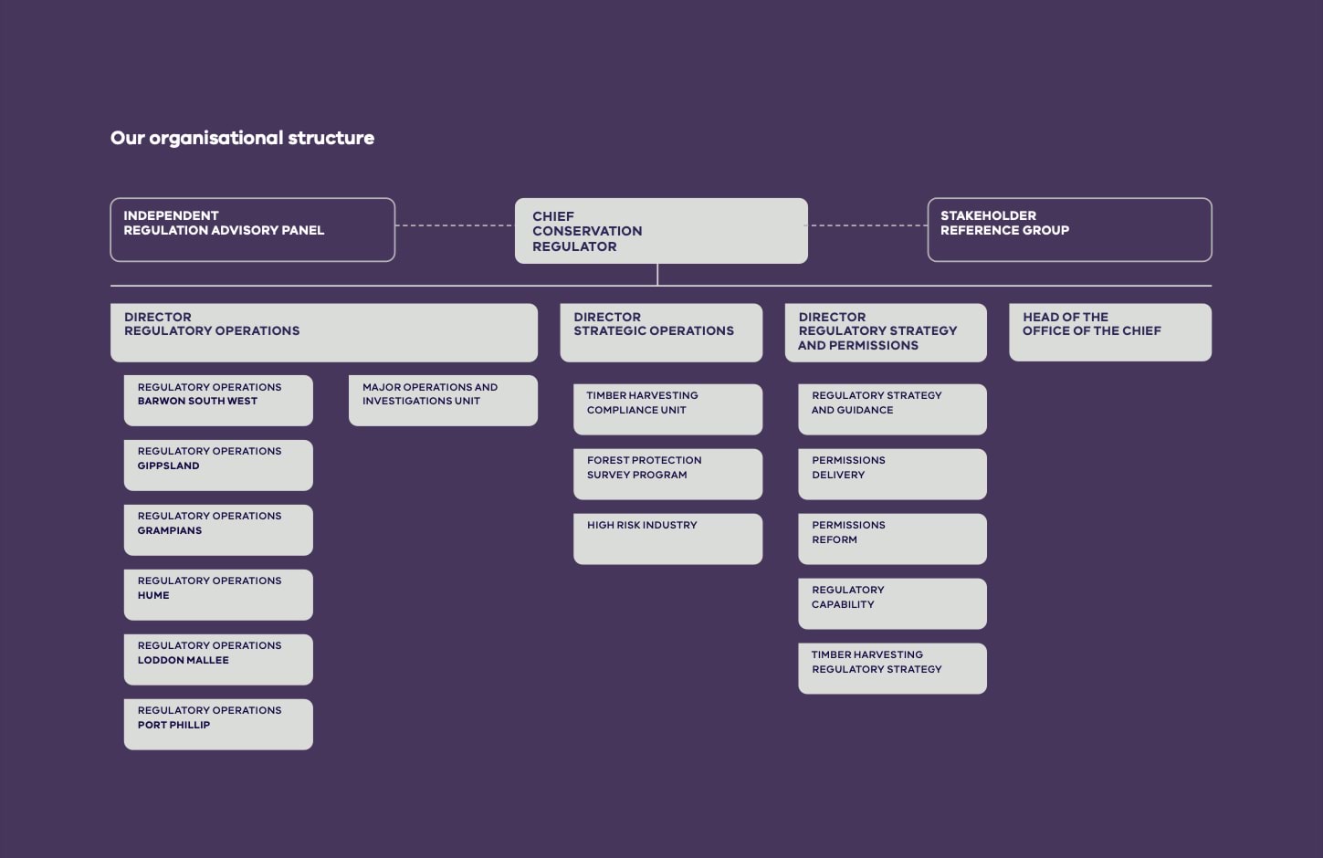 The Conservation Regulator is led by the Chief Conservation Regulator and is comprised of four business units