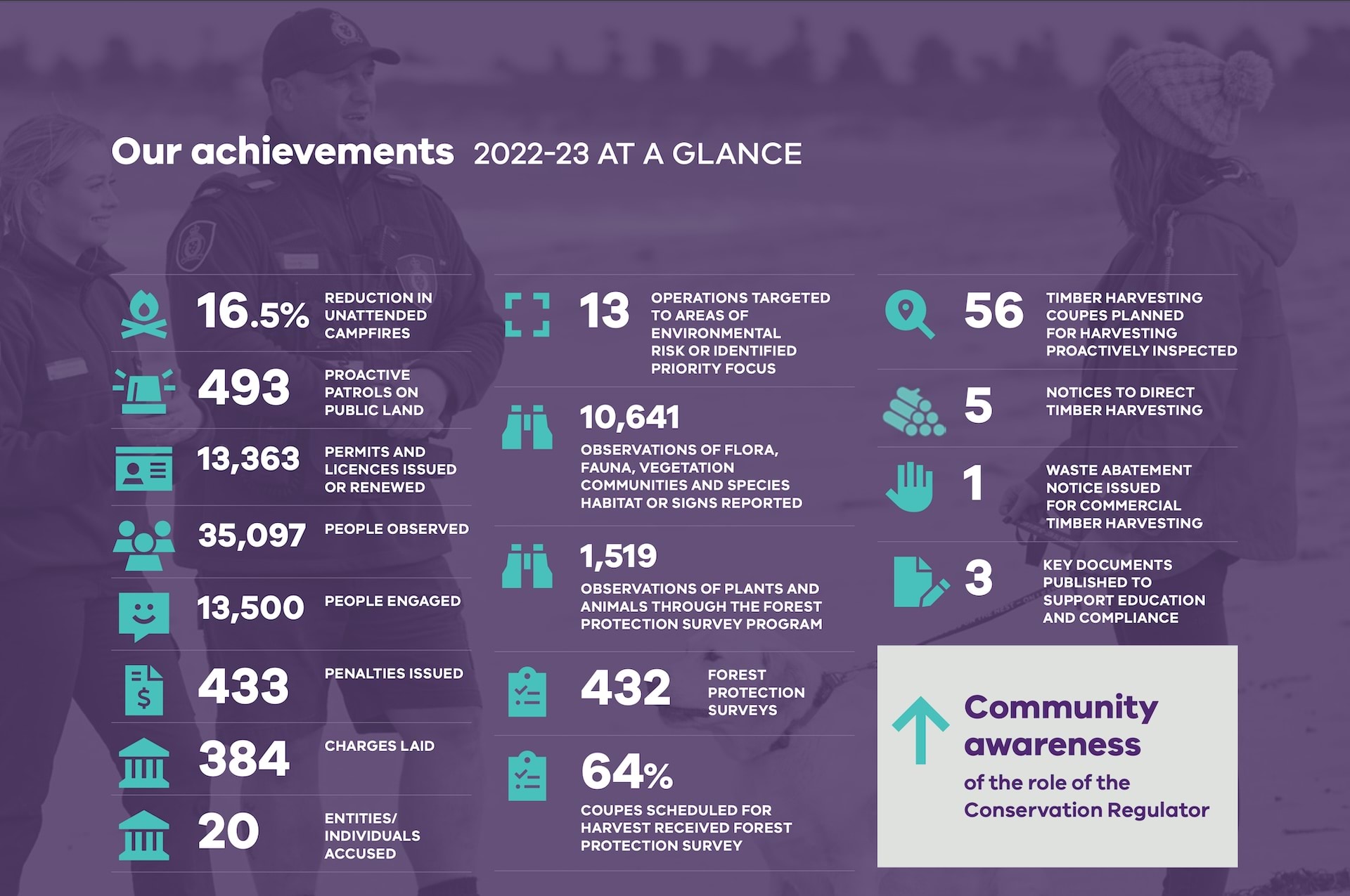In 2022–23, our regulatory priorities remained unchanged given the continued trends of high public land visitation, increased sales of off-road vehicles, demand for native wildlife as pets, changes in energy demands increasing illegal firewood theft, and consistently high numbers of illegal campfires, particularly over public holiday periods.