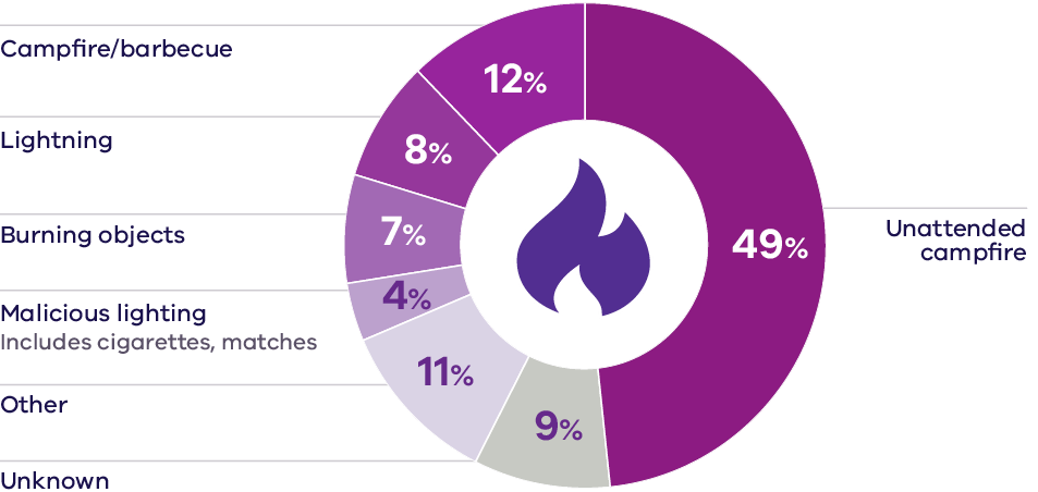 In 2023–2024 approximately 50% of all bushfires were caused by unattended campfires. This is consistent with the data captured over the last eight years, which shows unattended campfires have accounted for approximately 45% of all bushfires.